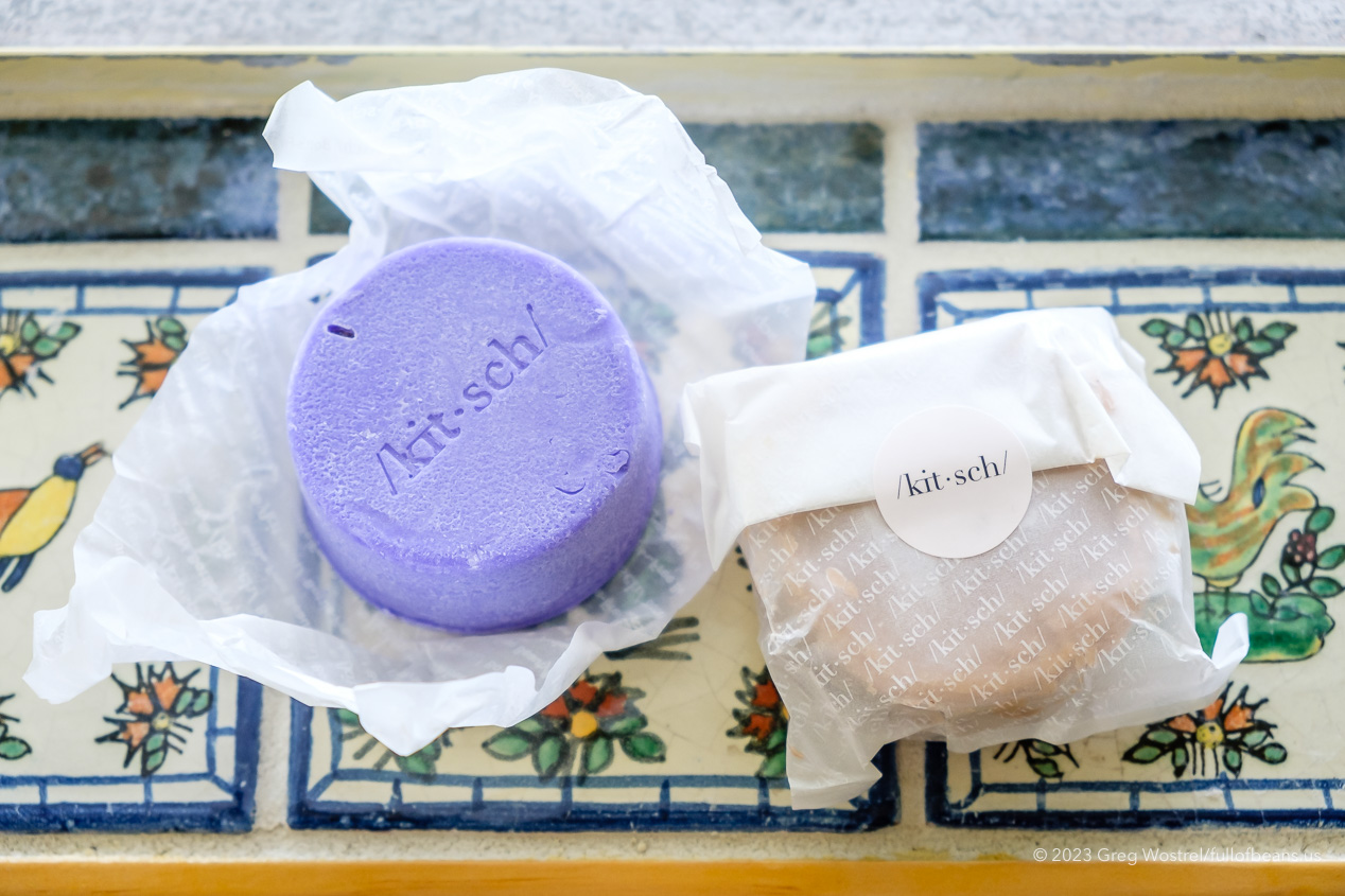 From the start, Kitsch made a great impression. The two bars I ordered came in a plain brown box, just big enough for the products inside. No plastic wrap, no bubble wrap, no styrofoam peanuts. Their stylish minimal packaging is a small box with a paper-wrapped bar inside. Nothing extraneous and no fuss. Love it!