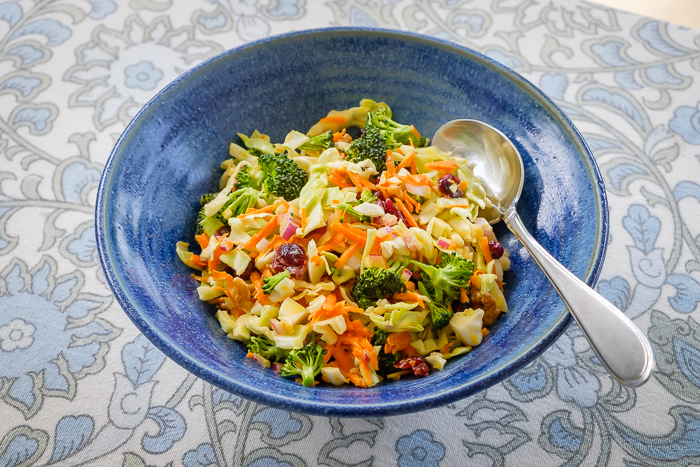 This recipe offers the sweetness of the dressing and cranberries with the crunch of veggies and the lovely bite of raw red onion. I through in a cup of broccoli on one go-round because I had it in the fridge (and I HATE throwing away veggies that don’t get used). I knew right away that it was a keeper.