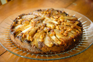 - Fold in the flour mixture and pour the batter over the pears.
