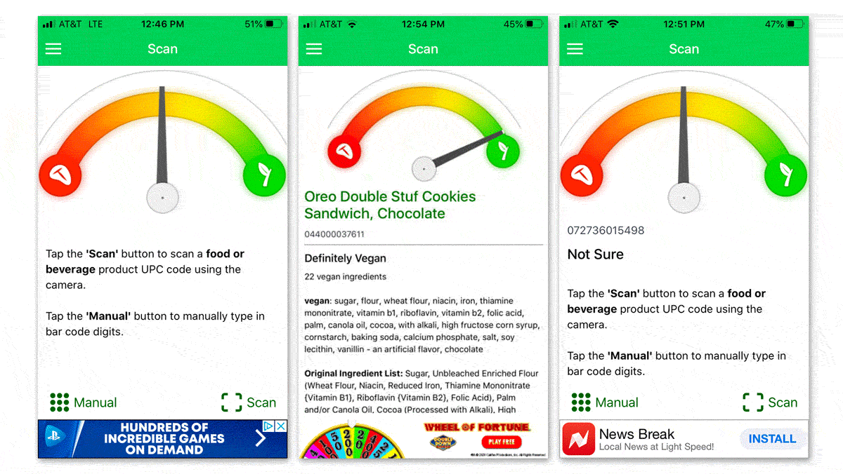 Using it is simple: launch the app, tap the Scan button, center the window over the suspicious product’s barcode, and ZIP you get “yes”, “no”, or a “not sure”. The “not sure” seems to happen on foods that aren’t in their database BUT when the answer is in between yes/no Is It Vegan offers information about questionable ingredients. Which helps one learn and to make a decision.