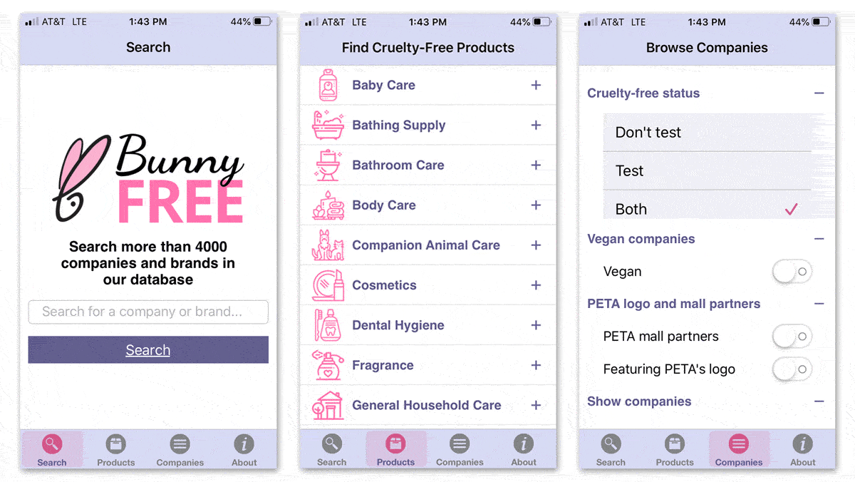 Bunny Free is another app that scans barcodes. What makes it a tad different is that it allows you to search specific brands and/or browse a large list, then Bunny Free tells you if the company is vegan, working for regulatory change, or testing on animals. This app really helps you vote for change with your dollars (or your local currency). It can also be quite surprising to discover companies that aren’t so cruelty-free!