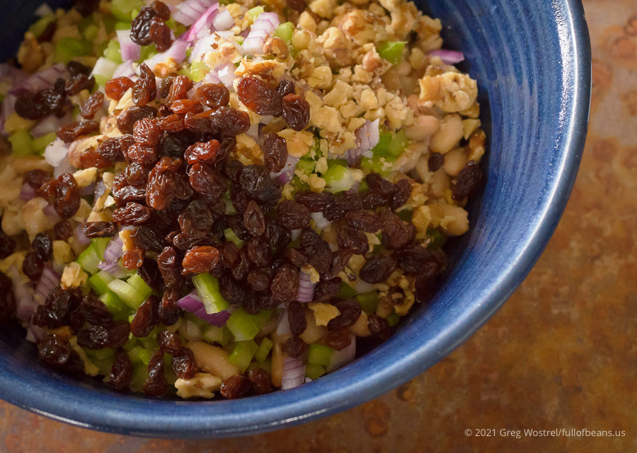 combine the beans, onions, celery, nuts, and raisins—gently mashing about 2/3 of the beans in the process