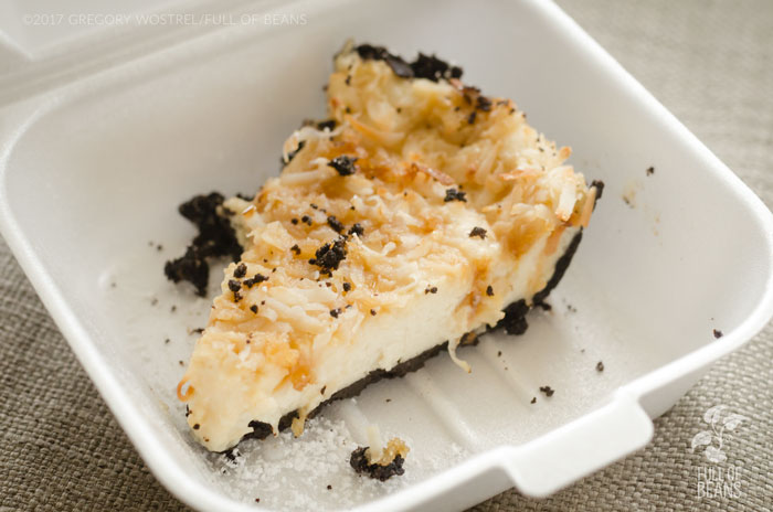 We were completely stuffed after our sandwiches. But there was cheesecake. With chocolate cookie crust. We decided to take that to-go so that we could give it the attention it deserved, but we should have ordered 2 pieces. The coconut cheesecake texture was dense and creamy without being heavy, and the flavor was excellent. I think the dessert selection changes daily so we were there on a very good day.