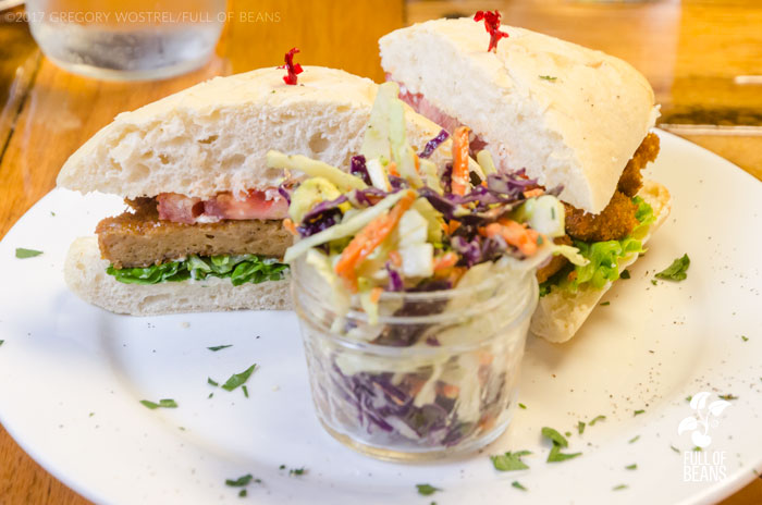 I had the Crispy Chicken Sandwich with a side of avocado slaw. The sandwich transported me back to the Good Harbor beach club, where my girlfriend and I would have chicken club sandwiches for lunch on her mother’s tab. It always felt so special and indulgent and this sandwich evoked the same thoughts and sweet memories. The seitan “chicken” was crispy on the outside and moist on the inside, so the flavor and texture would satisfy even the most resistant meat eater. To top it all off, it was wrapped up in a to die for ciabatta roll. The crisp, sweet, and tangy avocado slaw was the perfect compliment.