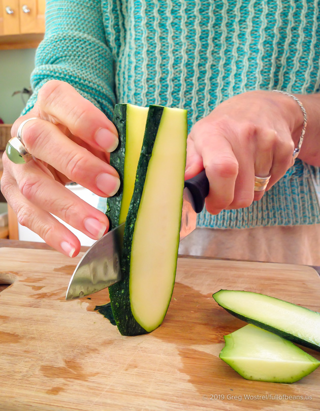 Slice zucchini into vertical slices, 1/8 to 1/4 inch thick.
