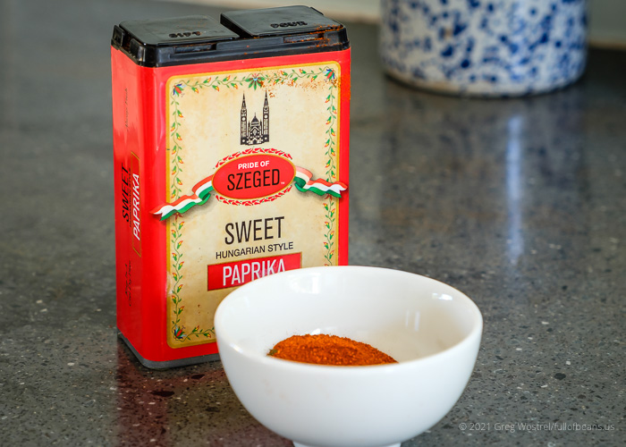 If you follow this blog and recipes, you know that I am pretty flexible about switching stuff out and using what is on hand. This recipe is absolutely the exception! You might have to do a little hunting, but getting the right paprika is essential to the recipe. If you can find it in a health food shop or Co-op, go for it, because the fresher the better. I happened upon this jar of Hungarian paprika while traveling to see family and was psyched.