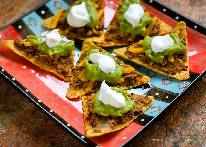 Vegan refried beans on tortilla chips with vegan shreds, guacamole, and non-dairy sour cream. Yum!